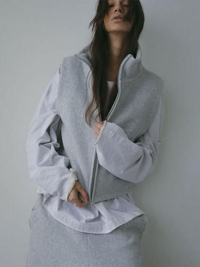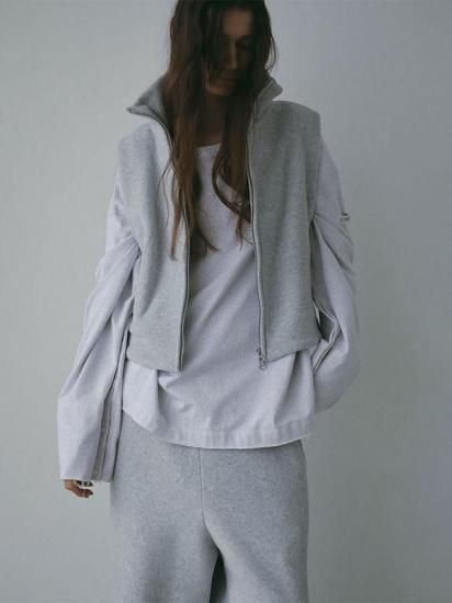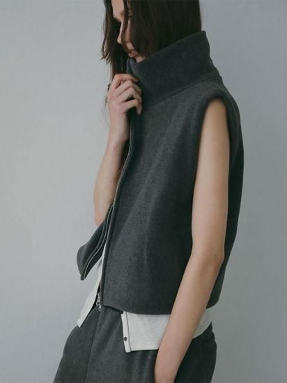 立ち上がるハイネックとダブルジップが、シンプルながらもスタイリングにニュアンスを加えてくれる一枚。